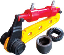 手動(dòng)高壓泵由操縱手柄,高壓泵、換向閥、油箱、壓力表和帶快速接頭的輸油管等組成。帶棘輪式液壓扳手由高壓油口、液壓油缸、曲柄、反力桿、棘輪裝置、套筒等組成、前者系動(dòng)力源部件,后者為扭矩執(zhí)行機(jī)構(gòu)。